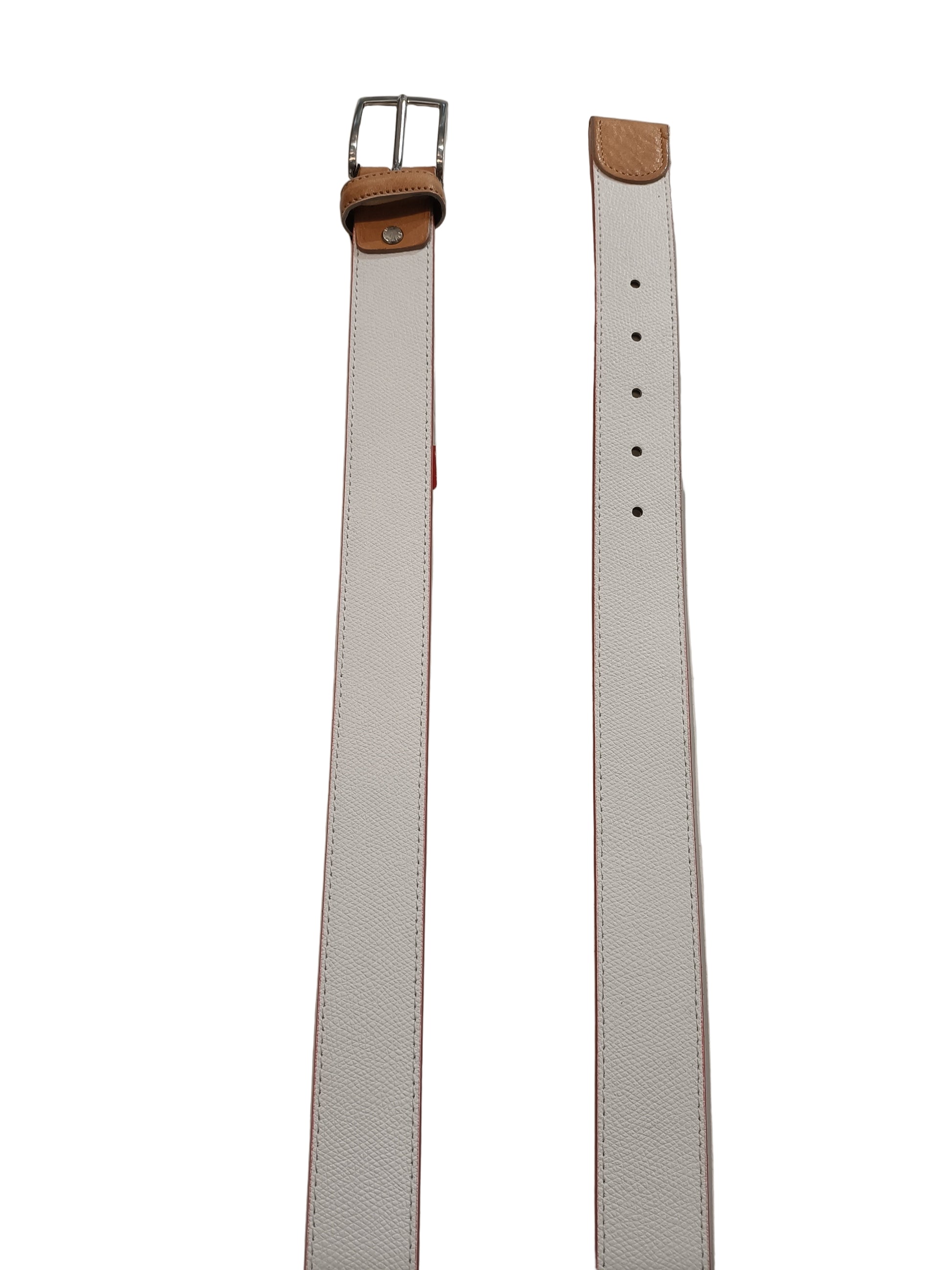 Cintura in pelle bicolore, con fascia principale bianca e dettagli terminali in pelle color cuoio. Presenta cuciture marroni sui bordi per un effetto a contrasto. Fibbia ad ardiglione in metallo argentato. Accessorio distintivo e moderno per look smart-casual.