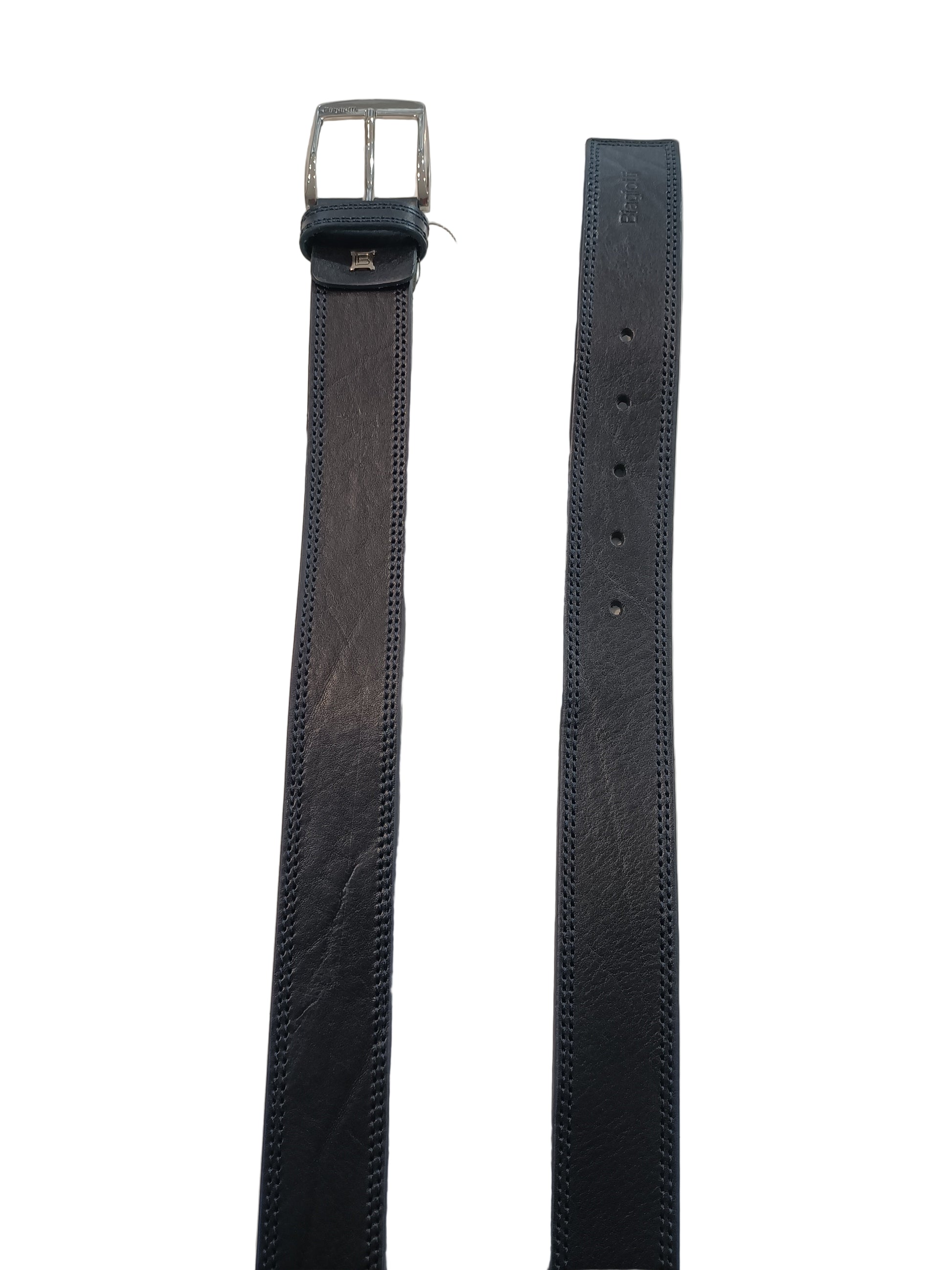 Cintura in pelle blu navy opaca, caratterizzata da una cucitura lungo i bordi e una leggera texture a grana. Presenta una fibbia ad ardiglione di forma rettangolare in metallo argentato. Accessorio classico ed elegante, perfetto per abiti o pantaloni chino.