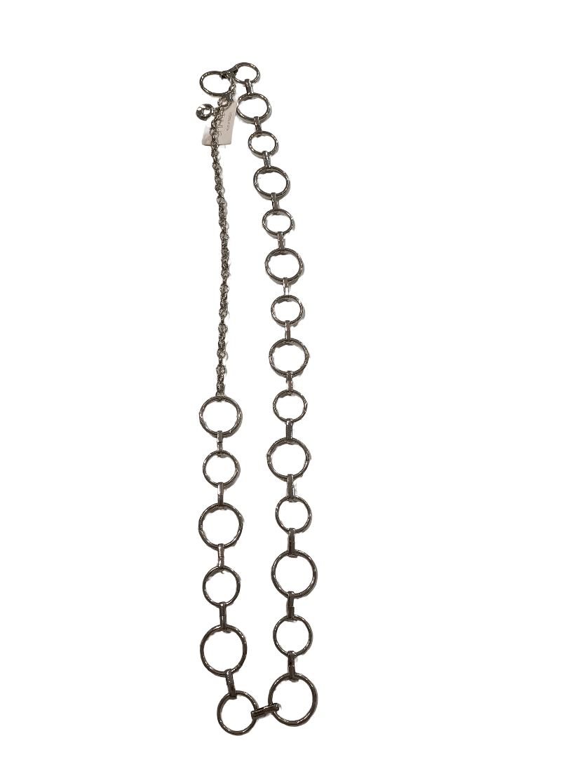 Cintura in catena oversize in metallo, caratterizzata da maglie circolari larghe e martellate. Accessorio versatile con chiusura a moschettone, ideale per un look d'impatto su capi di abbigliamento, utilizzabile anche come collana lunga.