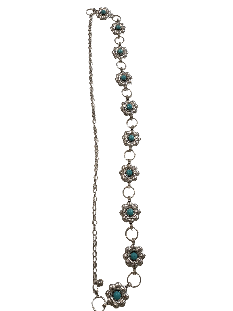 Cintura gioiello a catena in metallo argentato. Il corpo principale è costituito da una serie di elementi a forma di fiore con al centro un inserto color turchese. È un accessorio decorativo e regolabile, ideale per aggiungere un tocco di colore per qualsiasi outfit.
