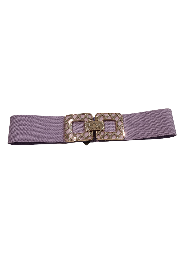 Eleganza romantica. Cintura elastica larga in una sofisticata tonalità lilla, ideale per definire il punto vita. La chiusura frontale è impreziosita da una fibbia doppia con design a griglia color oro e smalto chiaro. Accessorio perfetto per abiti e camicie lunghe, per una silhouette definita.