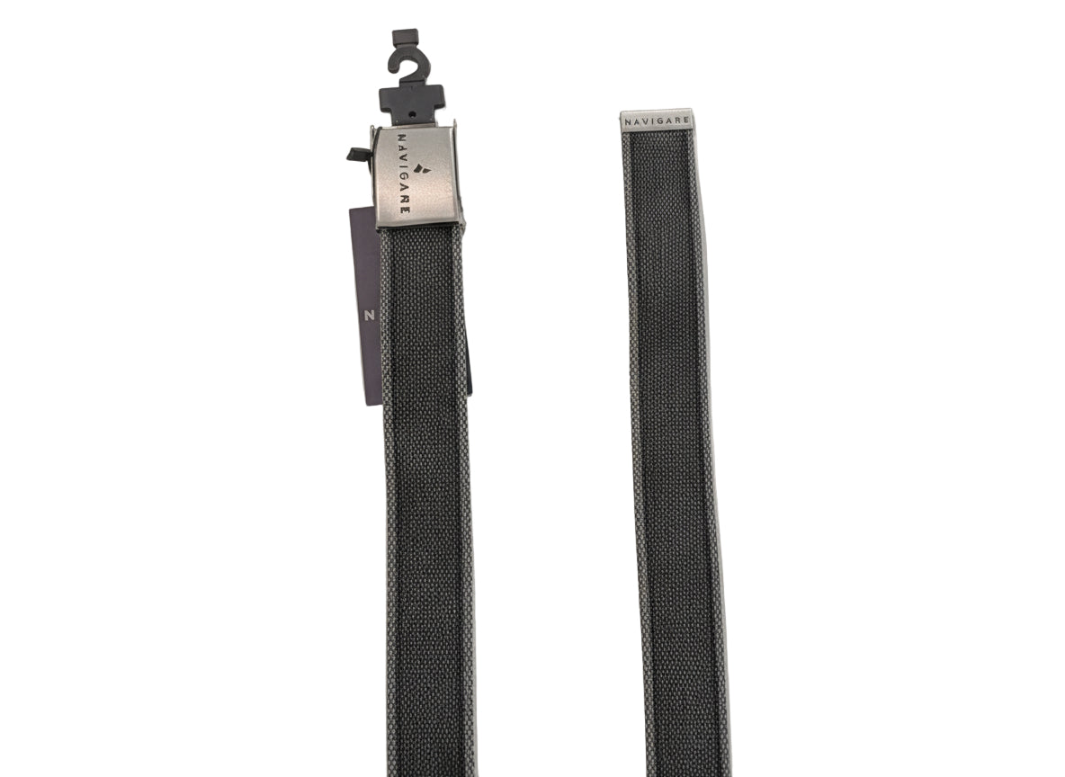 Questa sembra essere una cintura in tessuto tecnico con un sistema di chiusura a fibbia scorrevole o automatica in metallo.