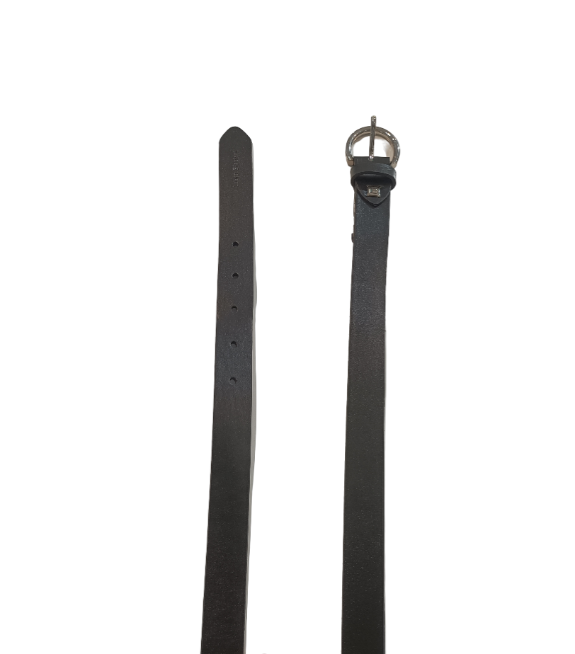 Cintura in pelle minimalista, sottile, dotata di una fibbia ad ardiglione in metallo lucido, ideale per completare un look elegante o sartoriale con discrezione.