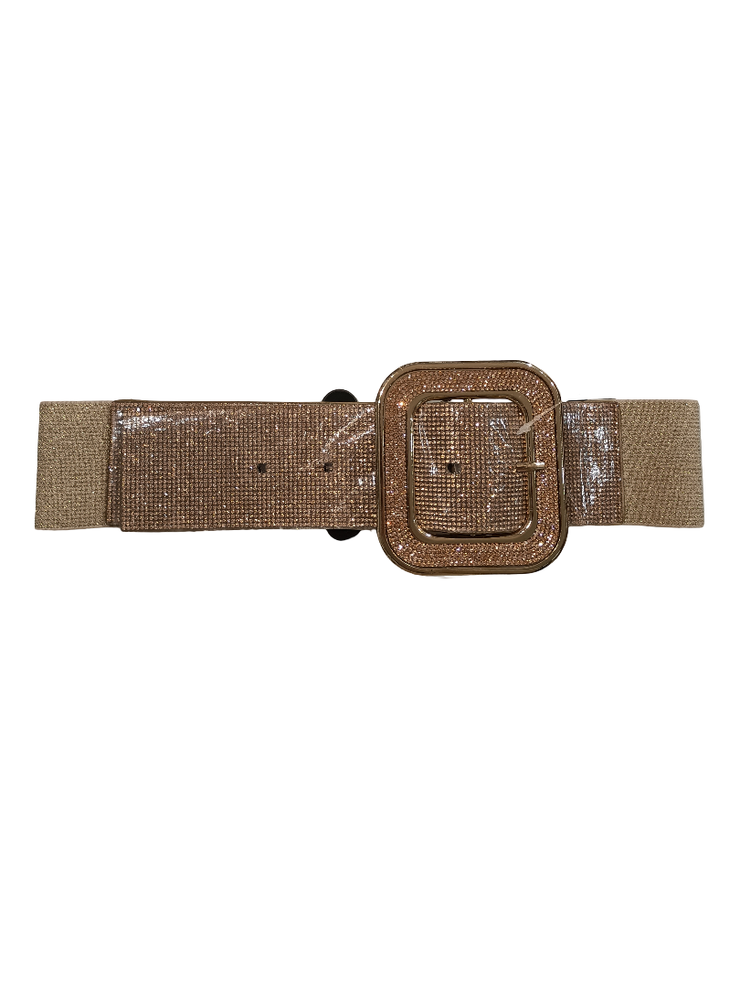 Definisci il punto vita con un tocco di luce. Cintura elastica ricoperta di glitter e strass color oro/oro rosato. La fibbia a spillo, anch'essa tempestata di strass, aggiunge un tocco di lusso. Ideale per abiti da sera e capispalla, garantendo vestibilità e un effetto statement.