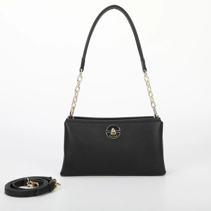 BORSA A TRACOLLA CON CHIUSURA VERNICIATA IN TINTA e con tracolla arricchita da catena