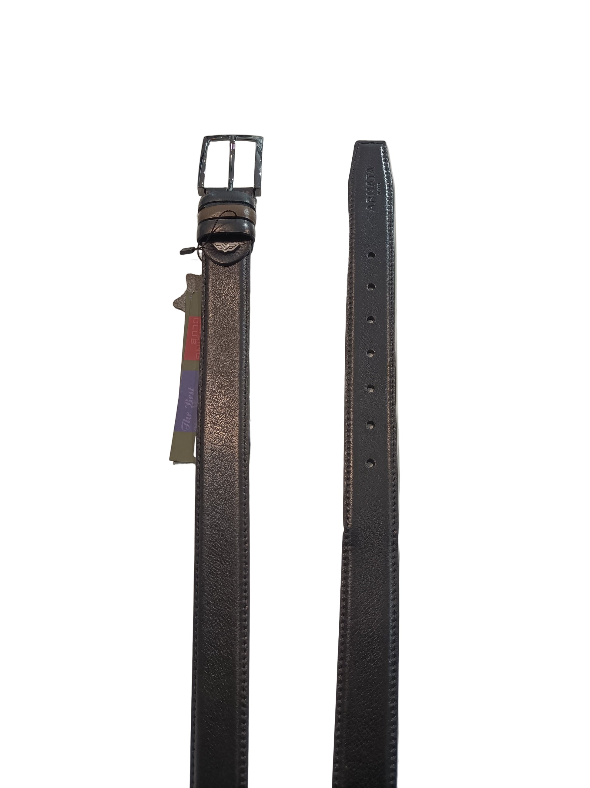 Cintura da uomo in pelle nera a grana fine. Presenta un design classico e liscio, rifinito con cuciture lungo i bordi e fori standard. È dotata di una fibbia rettangolare a telaio con finitura in metallo scuro.