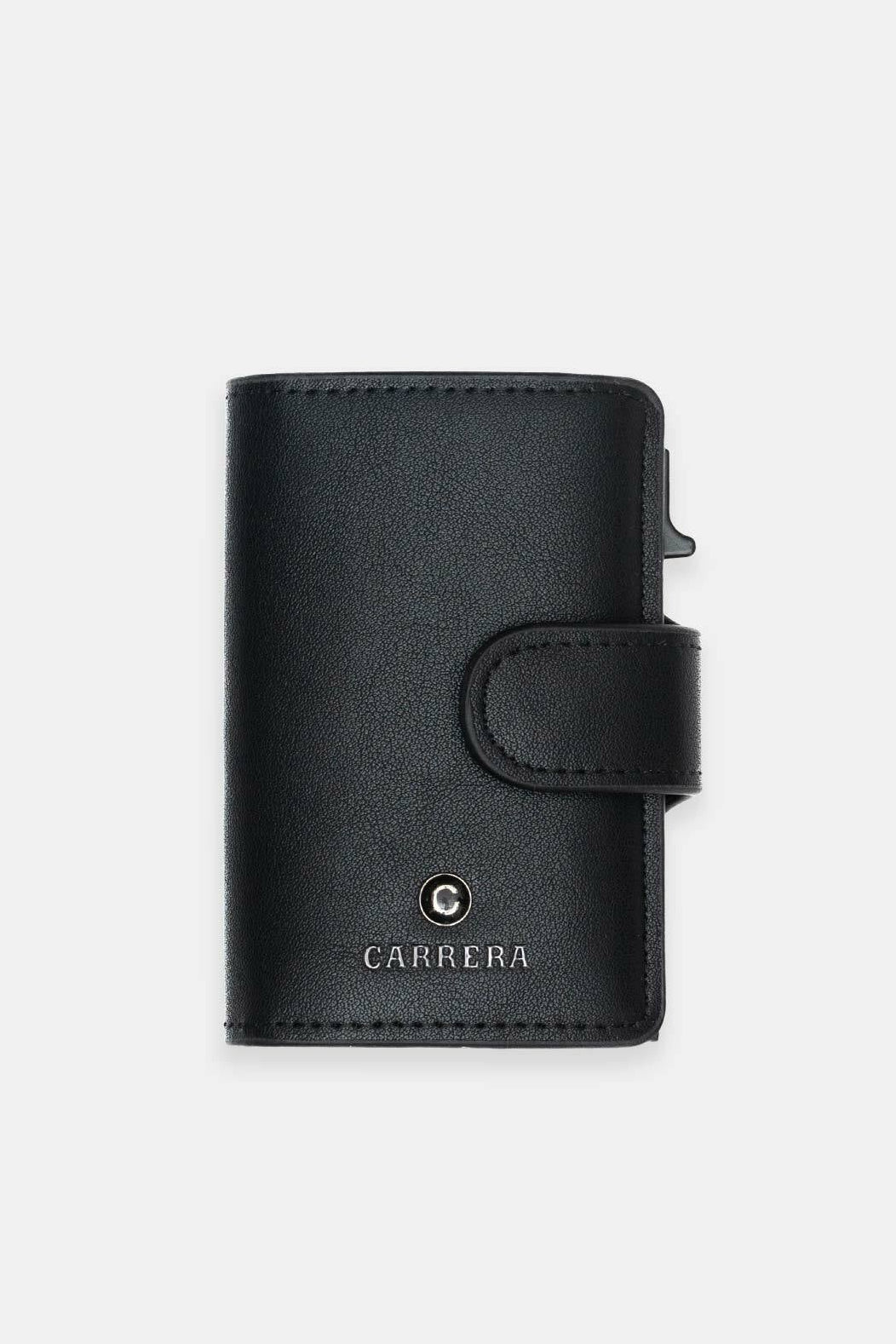 Porta carte da uomo in metallo ricoperto con pelle sintetica colore nero con logo Carrera . Dimensioni portafoglio chiuso 8 x 11 cm.