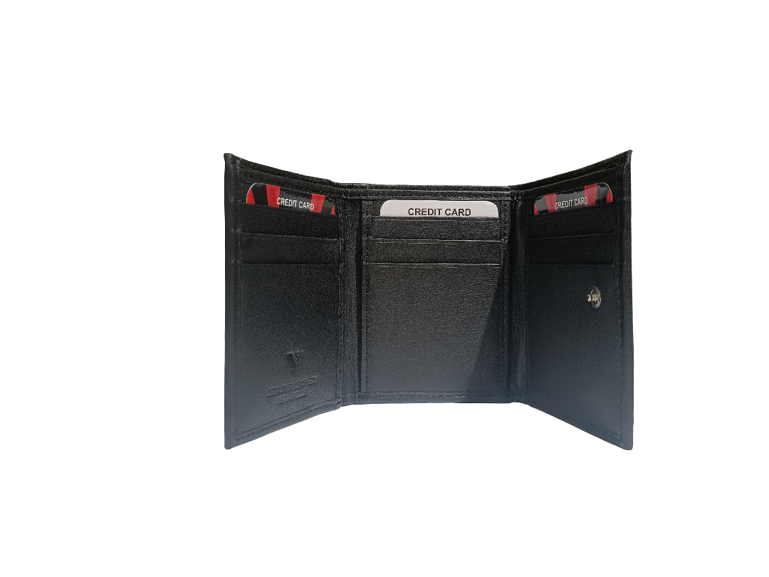 Un portafoglio pratico e compatto che si apre con un bottone di sicurezza. All’interno si trovano diversi scomparti dedicati alle tessere, organizzati in modo da garantire un facile accesso e una buona organizzazione. Sul retro, un altro vano si apre con un bottone e ospita lo scomparto per le monete, ideale per conservarle in modo sicuro e comodo. Un accessorio funzionale, perfetto per chi cerca praticità senza rinunciare a un design semplice ed essenziale.