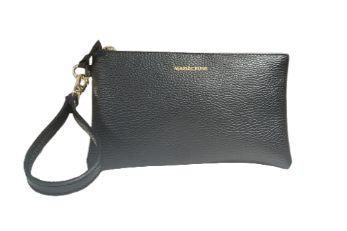 Clutch in vera pelle compatta e sottile, ideale per l’essenziale. Realizzata in materiale morbido, ha una chiusura a zip e un laccetto da polso per portarla con comodità. Perfetta da usare da sola o come organizer dentro una borsa più grande.